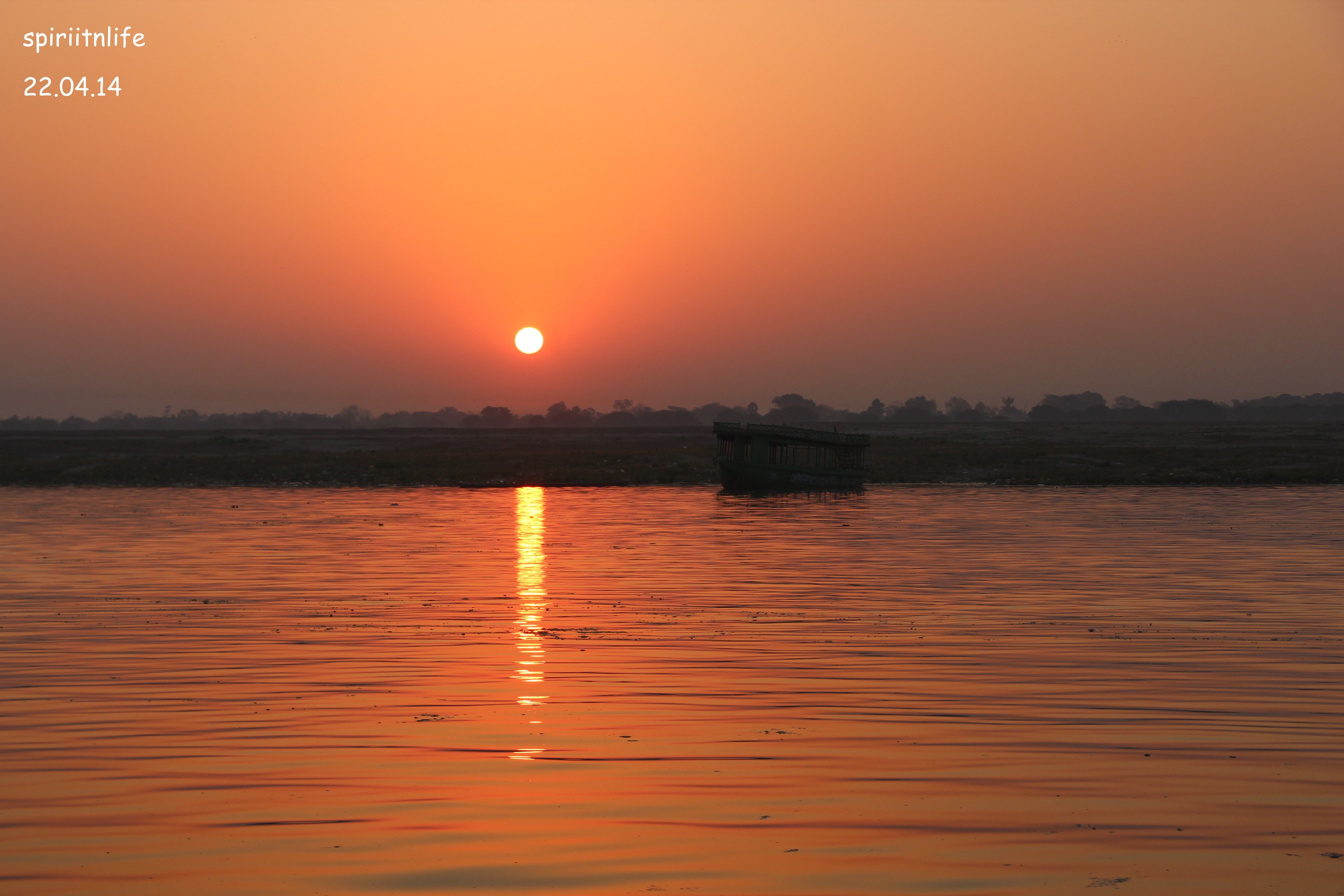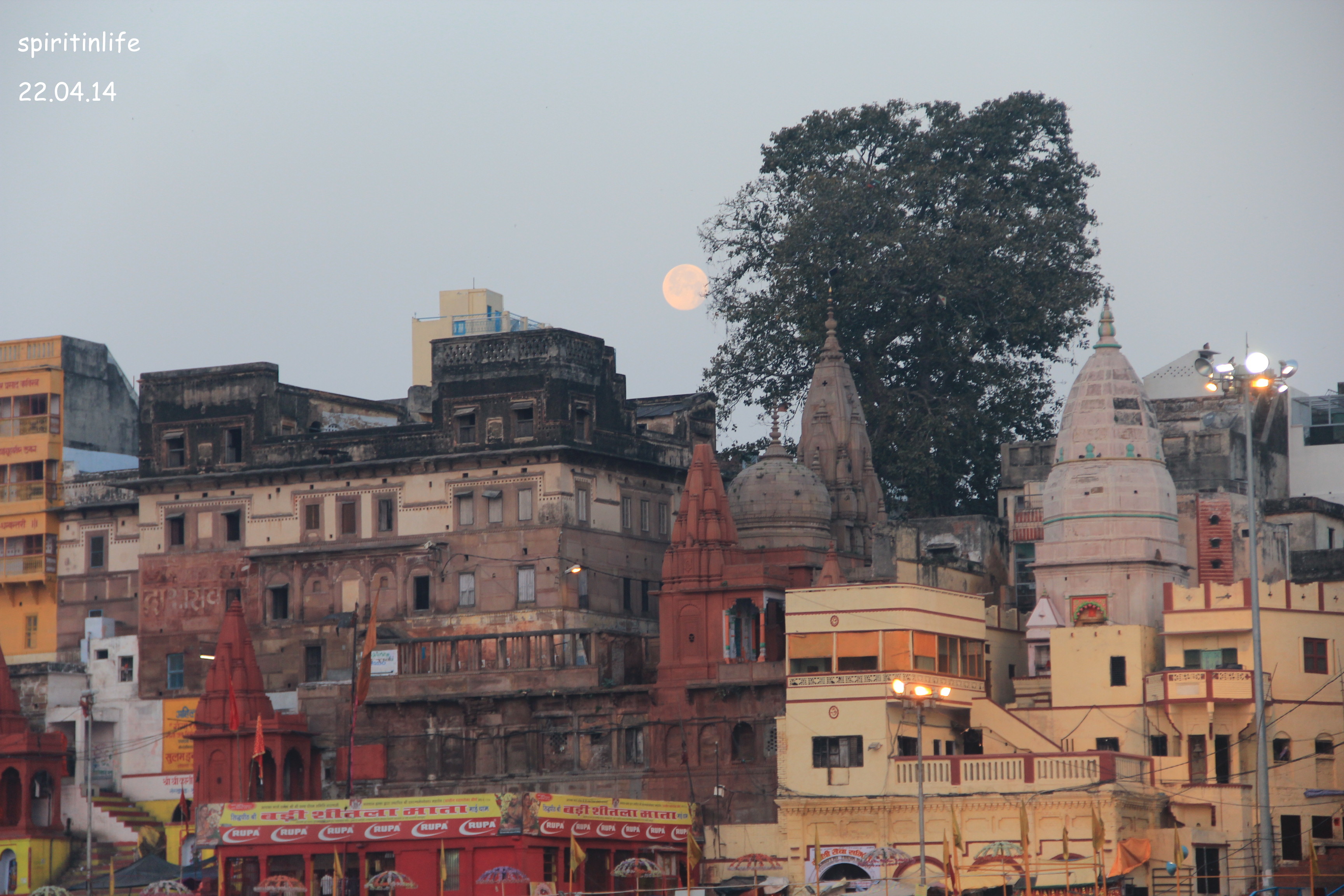 When we brought our boat back to the ghat after seeing Sunrise from a point, another memorable spectacle…. Moon near an ancient temple. Sun was on east side and the Moon on the western side. Humbly prostrated to the two heavenly bodies made by God and an integral part of our very existence…..